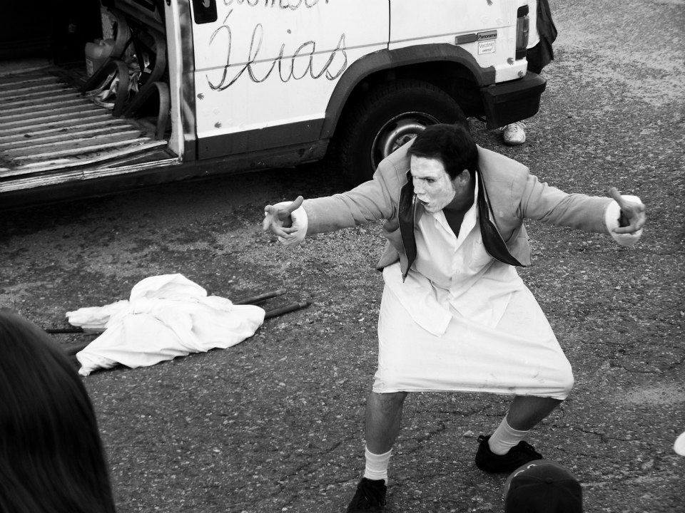 Hned po skončení jsem se co nejrychleji přesunula na Malé náměstí, kde už tou dobou začínalo hrát divadlo KočéBR svou Iliadu. A započala krvavá řež mezi Trójany a Achajskými. Jen, co jsem se stačila zorientovat ve změti jmen, už jejich majitelé padali jako mouchy. Ještě štěstí, že děj pravidelně přerušovalo zpravodajství ze studia Olymp, aby nám samotný Zeus ze svých výšin na střeše dodávky či moderátoři Kyklop a Kraken a další mohli celou situaci vyložit. Statný Achilleus uražen se stále odmítá zapojit do bojů, Agamemnón ošálen klamným snem posílá svá vojska na smrt, Patrokles umírá rukou Herakla a Achilleus konečně bere do rukou meč. A to všechno zvládli dva herci (Tomáš David a Vojtěch Johaník) a jedna herečka (Veronika Lazorčáková), neboť herečka další (Tereza Koláčková) v roli Dia neopouštěla svou střechu. Pravda, že do rolí k smrti odsouzených vojáků neváhali obsadit diváky. Na KočéBR se dozajista vydám i do třetice. A maraton pokračoval.